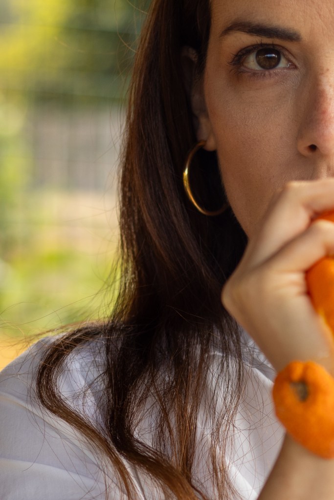 ¿Cómo de acelerada vivo si (creo que) no tengo tiempo para comer una naranja entera? Sé que los diseños y avances nos facilitan la vida, y eso está bien, pero ¿es realmente necesario que alguien me pele una naranja? Por eso decidí y creé todo este melodrama alrededor de esta merienda común. Porque quiero sentirme autosuficiente, conectada con el fruto, sus pielecillas y sus semillas. Quiero poder estar cómoda con la pulpa y el desorden, con la incertidumbre. Con la imperfección.